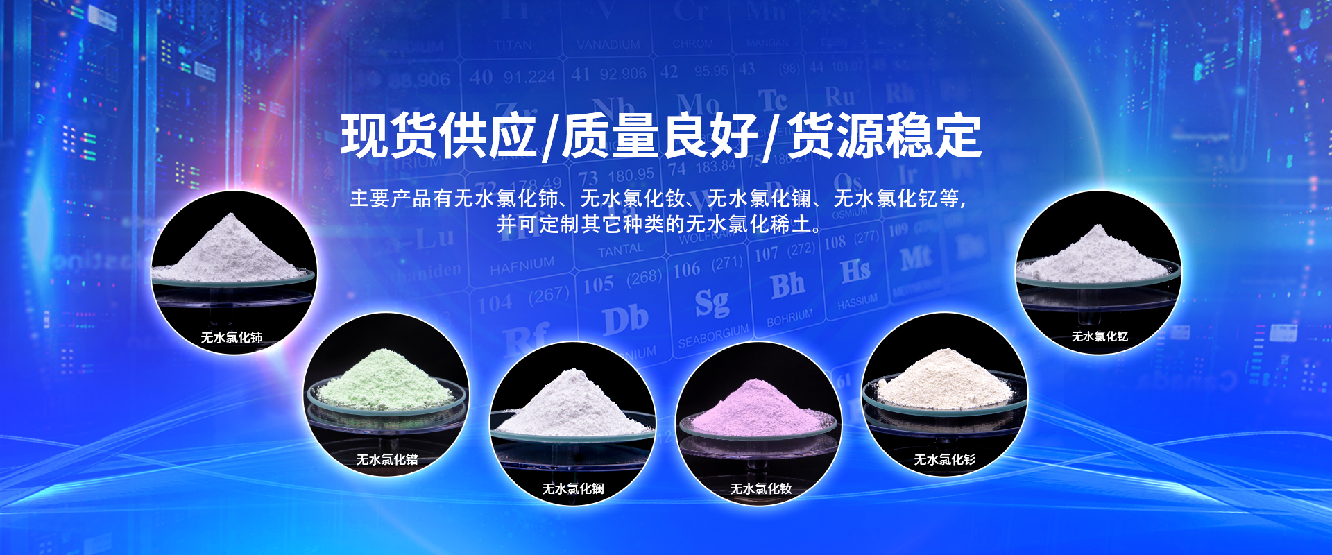 公司是國(guó)內(nèi)較早開(kāi)始規(guī)模生產(chǎn)高純度單一無(wú)水氯化稀土的廠(chǎng)家,主要產(chǎn)品有無(wú)水氯化鈰、無(wú)水氯化鑭、無(wú)水氯化釹、無(wú)水氯化釔、無(wú)水氯化鐠、無(wú)水氯化釤、無(wú)水稀土氯化物及稀土技術(shù)轉(zhuǎn)讓、咨詢(xún),并可定制其它種類(lèi)的無(wú)水氯化稀土。價(jià)格合理,產(chǎn)品暢銷(xiāo)江蘇、天津、浙江、安徽、湖南、湖北、上海、廣州等全國(guó)各地。